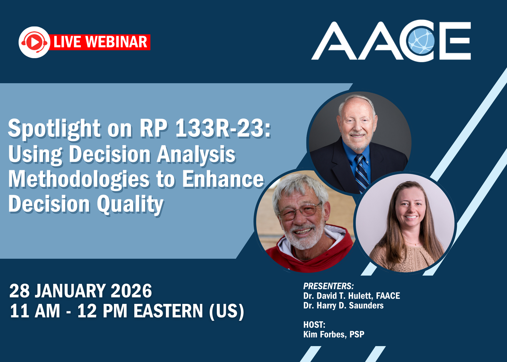 About Recommended Practice 133R-23:This recommended practice (RP) of AACE International defines the use of the discipline of decision analysis (DA) to structure, analyze, and generate stakeholder decision buy-in and commitment to important organizational decisions, whether made by a team, group or individual. It illustrates how modern decision analysis methods can be applied broadly to making decisions on projects, programs, and at the enterprise level in the presence of uncertainty.About AACE Recommended Practices:The AACE International Recommended Practices (RPs) are a series of documents that contain valuable reference information that has been subject to a rigorous review process and recommended for use by the Technical Board. RPs are intended to be the main technical foundation of AACE educational, and certification products and services. All RPs are available to AACE members free of charge.NOTE: The webinar is free, but registration is required. CEUs will be available for both members and nonmembers. You will need to create an AACE International account prior to registering if you do not already have one. Click here and then choose 'New User' to create your AACE account.