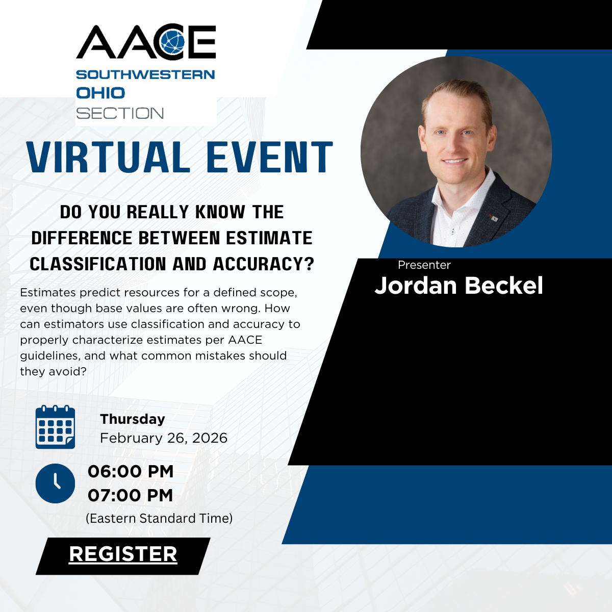 We are pleased to welcome Jordan Beckel, CEP, CCP, PMP, the Senior Estimator and Risk Manager at Svante, as our featured speaker for this virtual session on February 26. A seasoned expert with over 20 years of experience in cost engineering and an active member of the AACE Estimating Subcommittee, Jordan has spent two decades navigating the complexities of heavy infrastructure and mission-critical projects. In his presentation, "Do You Really Know the Difference Between Estimate Classification and Accuracy?" he will tackle the fundamental AACE principle that "every base estimate value will likely prove to be wrong." Jordan will break down how to properly characterize uncertainty through classification and accuracy guidelines, outlining the five essential components of a robust estimate statement while highlighting common pitfalls to avoid when communicating with decision-makers.